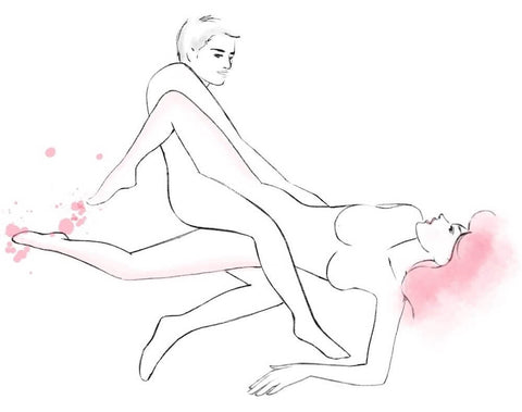 The woman, lying down, lifts her legs and the man, on his knees, penetrates. He supports her feet with his abdomen. In this position, the woman may experience lower back pain over time.
