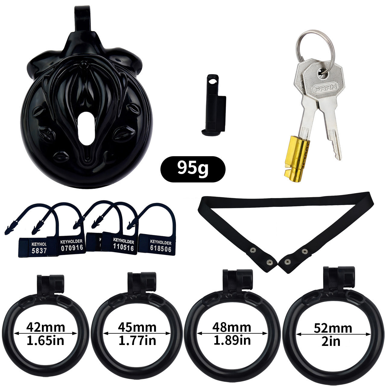 The FRRK Resin Male Sissy Realistic Pussy Chastity Cage features a realistic pussy design that will make your penis look like a vagina.Imagine the thrill of seeing your manhood transformed into a delicate, feminine slit, igniting a whole new level of sissy excitement. It also features 4 curve rings, ensuring a secure and comfortable fit. These rings not only enhance the overall aesthetic but also provide a customizable experience, allowing you to find the perfect fit for your unique anatomy.