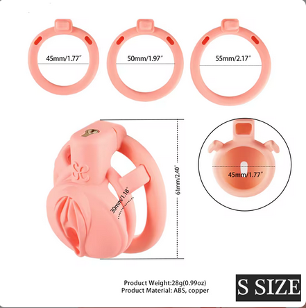 Available in two sizes, you can choose between the completely flat mini version, or the slightly larger (but still very small) version. Both provide ample ventilation thanks to the gaps between the ring and the clitoris. Both are easy to use, with a top down locking system. Even if you don’t have a Mistress you can still become the ideal sissy!