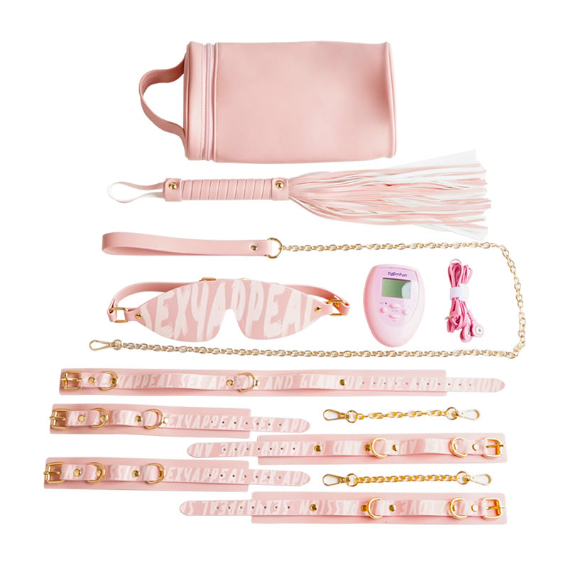 ELECTRIC SHOCK PLAY and STIMULATION! Novelty, fun, passion, let’s have fun tonight.It’s simple and easy to use. Set contains Traction collar, eye mask, bondage cuff,anklet,leather bag, electronic pulse massager.